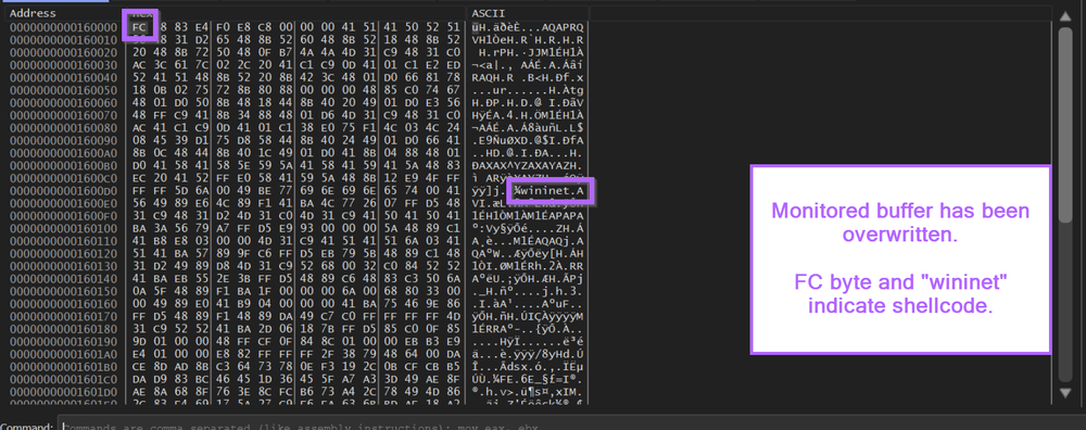 下面我们可以看到填充后的缓冲区。可以看到第一个字节是0xFC,并且在初始字节中有一个wininet字符串,这可能表示shellcode。