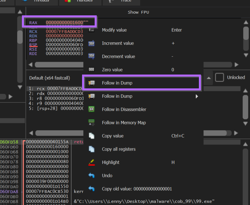 我们想继续监控这个缓冲区的可疑内容和解压缩的恶意软件时,可以通过右键点击RAX中包含的地址来开始监控过程。