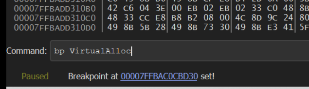 我们可以通过运行bp VirtualAlloc和bp VirtualProtect来创建2个断点。