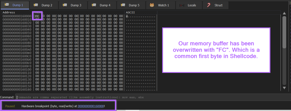 这样我们可以允许恶意软件继续执行。可以看到硬件断点被触发,在缓冲区的第一部分中包含一个FC字节。前两篇文章中已经讲过FC是shellcode中非常常见的第一个字节。