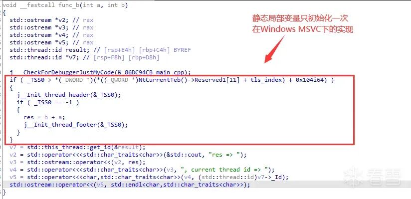 if(pOnce > *(int *)(NtCurrentTeb()->ThreadLocalStoragePointer[0] + 0x104) // tls中存储的全局 局部静态变量初始化计数器, 初始值为INT_MIN(0x80000000)