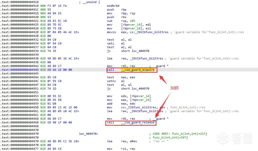 int __cxa_guard_acquire (__guard *g) // typedef int __guard, 初始值为0