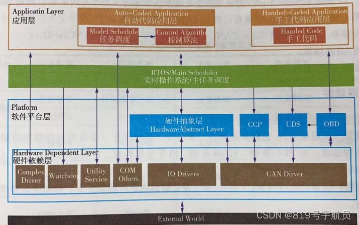 硬件依赖层(底层驱动):包括复杂驱动、看门狗、基础服务(系统调度所需定时器、中断管理和一些通用处理函数,如PLL驱动、Flash驱动、内存管理驱动、定时器驱动)、IO、CAN等其他驱动。