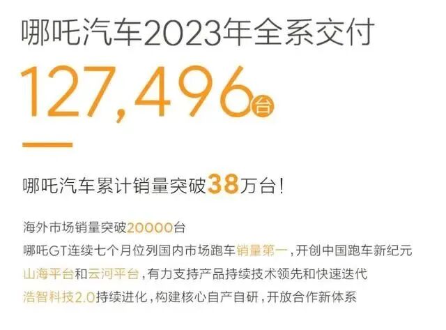2024年1月1日,哪吒汽车全年销量出炉。2023年,哪吒汽车累计交付127496台,稳居造车新势力第一阵营。其中,海外销量突破20000台,同比劲增567%。截至2023年12月底,哪吒汽车累计销量突破38万台。