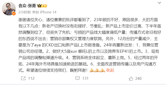 2024年1月2日,哪吒汽车CEO张勇竟然公开在线进行了反思,总结了2023年做的不好的原因,其表示: