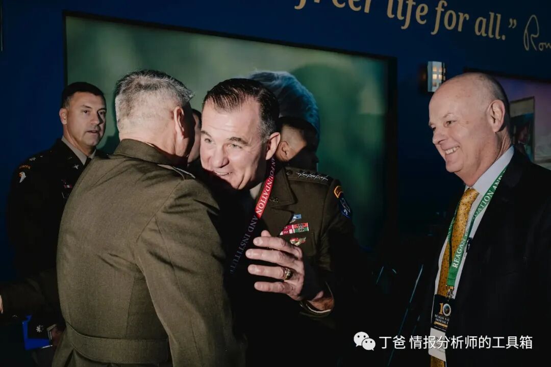 美国太平洋陆军司令查尔斯·A·弗林将军在里根图书馆与其他军事人员交谈。该活动吸引了高级军事领导人和营利性军火工业人士。