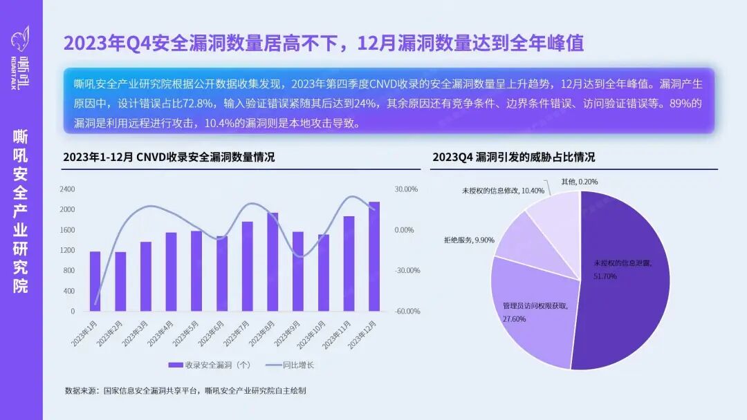 嘶吼安全产业研究院根据公开数据收集发现,2023年第四季度CNVD收录的安全漏洞数量呈上升趋势,12月达到全年峰值。安全漏洞居高不下的原因主要包括技术缺陷、程序错误,系统开发过程中的不足,以及人为因素,网络攻击的泛滥也使得安全漏洞的存在变得更为复杂。漏洞产生原因中,设计错误占比72.8%,输入验证错误紧随其后达到24%,其余原因还有竞争条件、边界条件错误、访问验证错误等。89%的漏洞是利用远程进行攻击,10.4%的漏洞则是本地攻击导致。