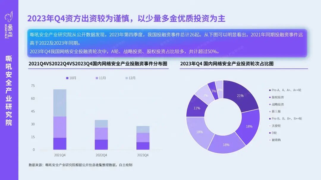 嘶吼安全产业研究院从公开数据发现,2023年第四季度,我国投融资事件总计26起。从下图可以明显看出,2021年同期投融资事件远高于2022及2023年同期。2023年Q4我国网络安全投融资轮次中,A轮、战略投资、股权投资占比较多,共计超过50%。