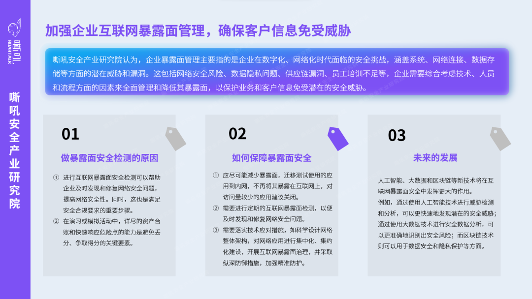 嘶吼安全产业研究院认为,企业暴露面管理主要指的是企业在数字化、网络化时代面临的安全挑战,涵盖系统、网络连接、数据存储等方面的潜在威胁和漏洞。这包括网络安全风险、数据隐私问题、供应链漏洞、员工培训不足等,企业需要综合考虑技术、人员和流程方面的因素来全面管理和降低其暴露面,以保护业务和客户信息免受潜在的安全威胁。