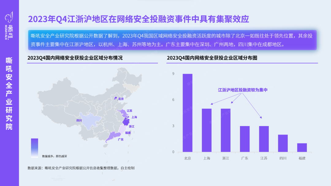 嘶吼安全产业研究院根据公开数据了解到,2023年Q4网络安全投融资事件主要分布在10余个省市地区,其中北京市投融资事件数量和金额稳居第一,江浙沪地区在总数上表现出色,占比近五成,显示出此地区强大的投融资实力。江浙沪地区的网络安全投融资区域以杭州、上海、苏州等地为主。广东主要集中在深圳、广州两地,四川集中在成都地区。由此看来,网络安全产业的发展主要集中在省会城市以及数字经济发达的地区。