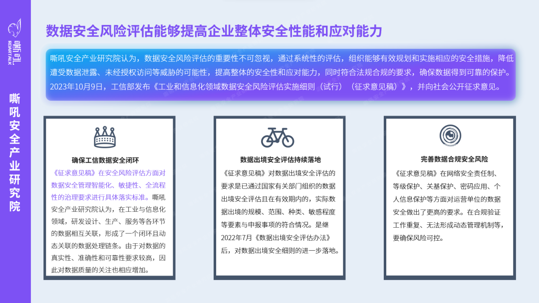 2023年10月9日,工信部发布《工业和信息化领域数据安全风险评估实施细则(试行)(征求意见稿)》,并向社会公开征求意见。《征求意见稿》共17条,明确了部省两级数据安全风险评估工作体系,并对重要数据和核心数据处理者的评估义务进行了细化。此外,还明确了行业主管部门监督管理评估活动的机制流程。