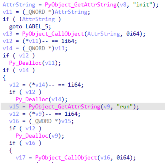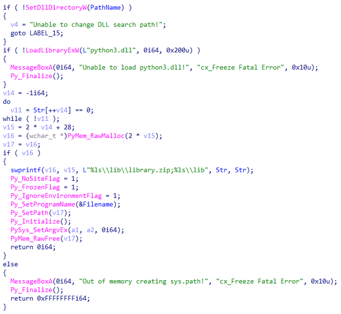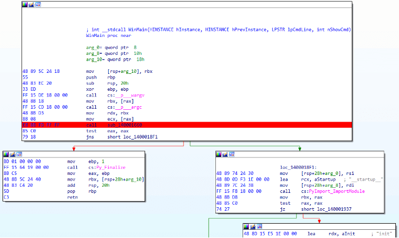 跟踪初始调用可以发现执行文件源自cx_Freeze工具。然后,脚本搜索目录“\lib\library.zip”,并使用“PyObject_CallObject”调用恶意Python代码。