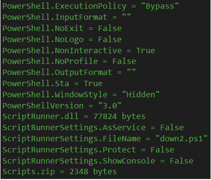 这个 .NET Microsoft Windows可执行文件的唯一任务是解压缩名为“down2”的嵌入式脚本,并使用PowerShell.exe执行它。打包的文件和PowerShell配置位于文件的资源部分,如下图所示。