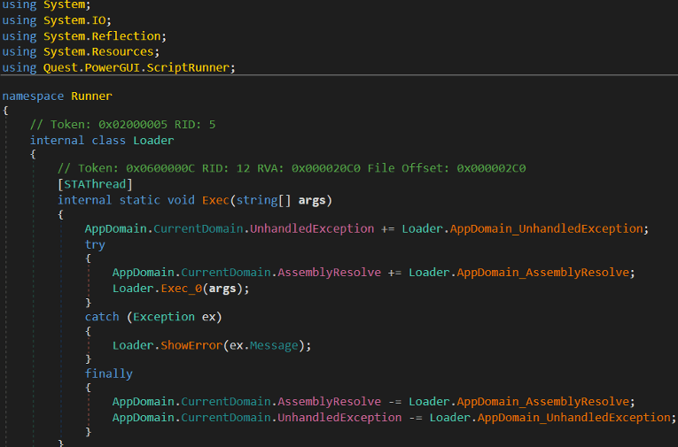通过“Loader”类中的字符串,可以发现恶意软件使用了PowerShell脚本编辑器,该编辑器将PowerShell脚本转换为微软可执行文件。