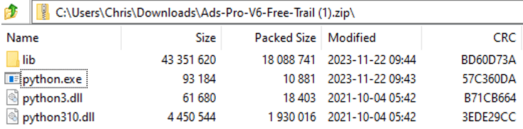 压缩文件“Ads-Pro-V6-Free-Trail (1).zip”包含多个文件。下图显示了解压文件夹的内容。在此文件夹中,两个DLL文件作为干净的组件,以方便“Python .exe”进程加载额外的Python代码。下图展示了“Python .exe”中的WinMain函数,清楚地表明这不是一个合法的Python可执行文件。