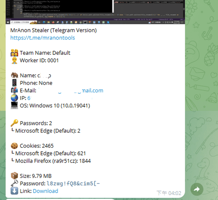 接下来,它压缩被盗数据,用密码保护数据,并将文件名指定为“Log(Username).zip”。压缩后的文件将使用URL上传到公共文件共享网站hxxps://store1[.]gofile[.]io/uploadFile。最后,它将下载链接和系统信息附加到一条消息中,该消息使用bot令牌6799784870:AAHEU6EUdnAjRcH8Qq0TCokNtVJSL06VmbU发送到攻击者的Telegram频道。