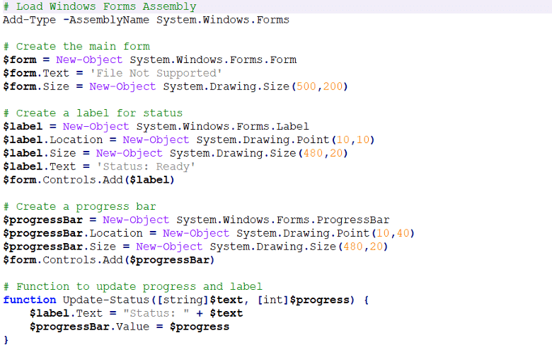 该脚本启动Windows窗体的加载并配置其设置,包括窗体、标签和进度条。此外,它在后续脚本的执行中定义了文本,以消除用户的疑虑。