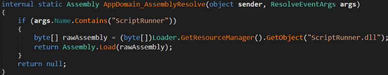 在检查下图所示的.NET可执行文件后,我们发现它利用ScriptRunner.dll提取“Scripts.zip”以获得一个PowerShell脚本。解压后的文件存放在以下位置: