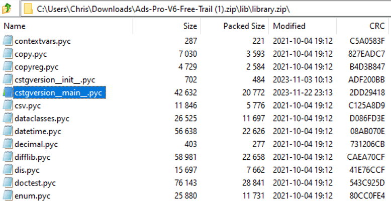 下图显示了“library.zip”中的文件。值得注意的是,与合法文件相比,“cstgversion_main__.pyc”由于其独特的创建时间而脱颖而出。此特定文件包含负责数据盗窃的主要函数。