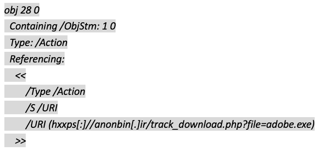 攻击者伪装成一家希望预订酒店房间的公司,发送主题为“12月房间可用性查询”的网络钓鱼电子邮件。该网站包含假日期间虚假的酒店预订信息,附加的恶意PDF文件有一个下载链接隐藏在对象中。其解码后的数据如下: