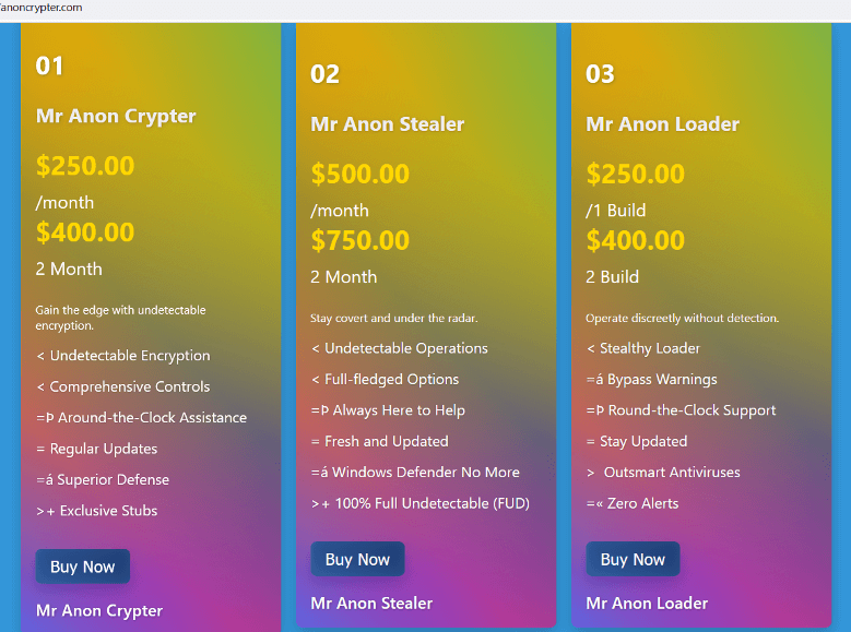 MrAnon Stealer的支持通道如下图所示。该支持渠道推广其产品,提供增强的功能,并在“hxxp[:]//anoncrypter[.]com”上为所有相关工具提供购买页面