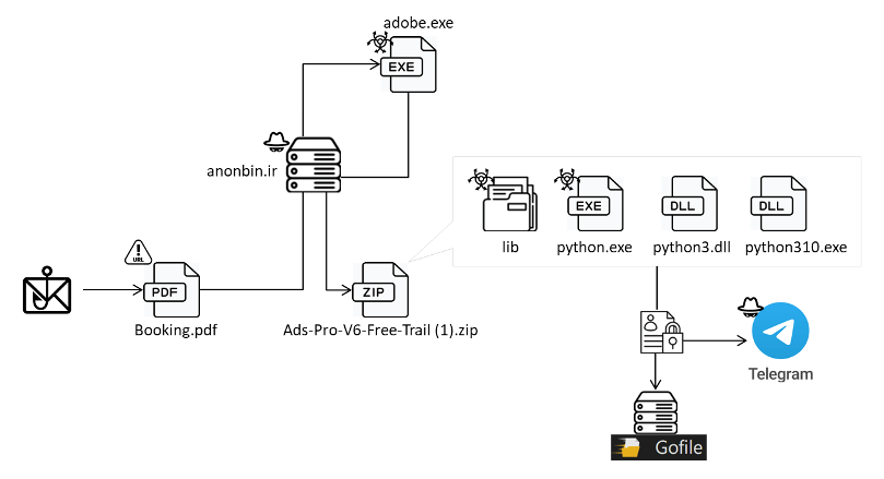 该恶意软件使用PowerGUI和cx-Freeze工具创建一个复杂的过程,涉及 .NET可执行文件和PowerShell脚本。攻击者还使用虚假错误消息等技巧来隐藏攻击活动,从特定域下载并提取文件,以运行有害的Python脚本。该脚本提取干净的DLL文件和名为“python.exe”的恶意软件,用来掩盖恶意有效负载MrAnon Stealer的加载。它从几个应用程序中窃取数据和敏感信息,然后将窃取的数据压缩并上传到公共文件共享网站和攻击者的Telegram频道,用户应小心网络钓鱼邮件和不清晰的PDF文件。