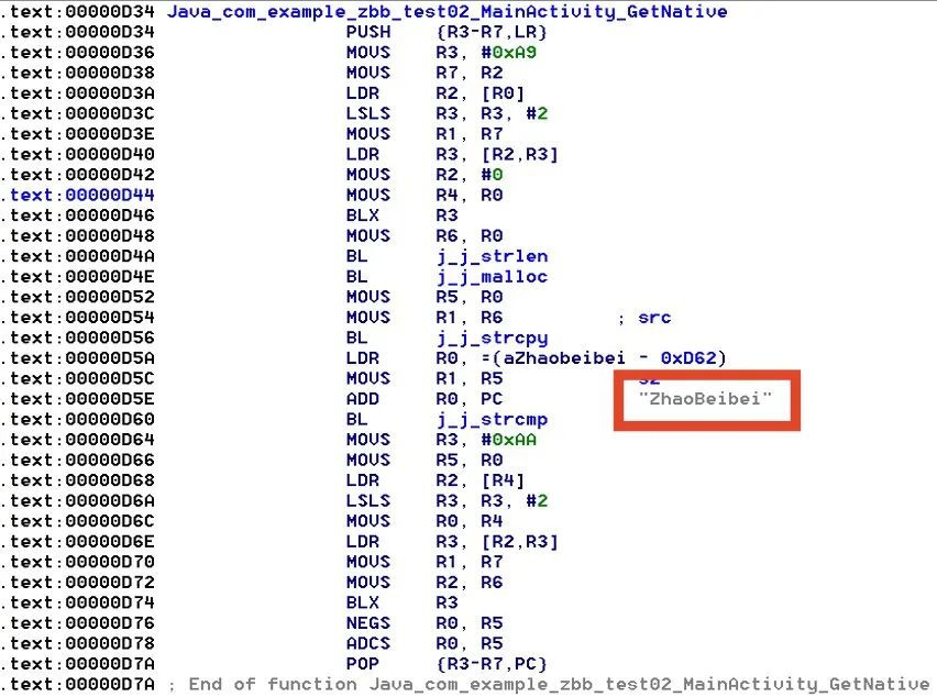 3. 使用IDA动态调试或直接ALT+T进行搜索GetNative。根据跳转和传送指令可知其密码。