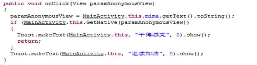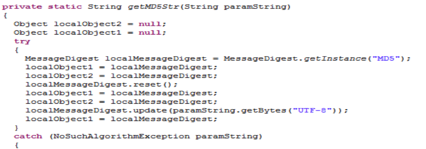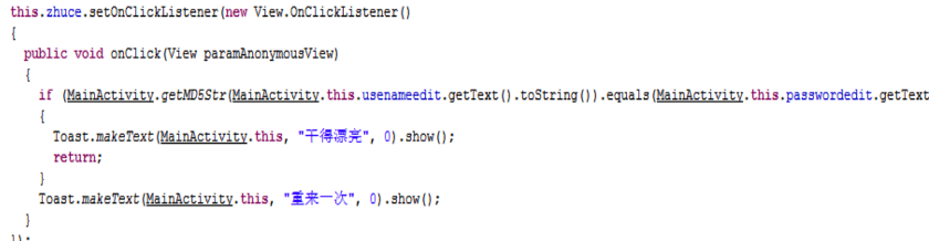 2. 伪Java中寻找关键代码,其跳转关键句在if..else语句,其中调用了getMD5str()函数,要搞定这个CrackMe需了解该函数。
