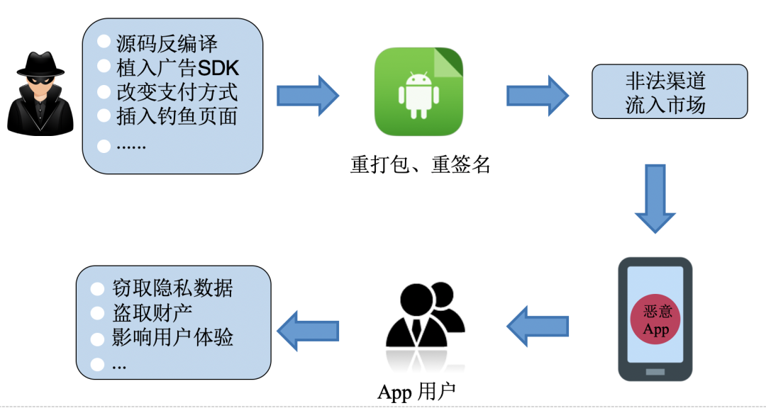 恶意攻击者利用反编译工具对App进行源码反编译、植入广告SDK、插入钓鱼页面,重打包和重签名后,恶意篡改后的App通过非法渠道流入市场。终端用户如果使用这些App,会有隐私数据泄漏、资金财产被盗取的风险。