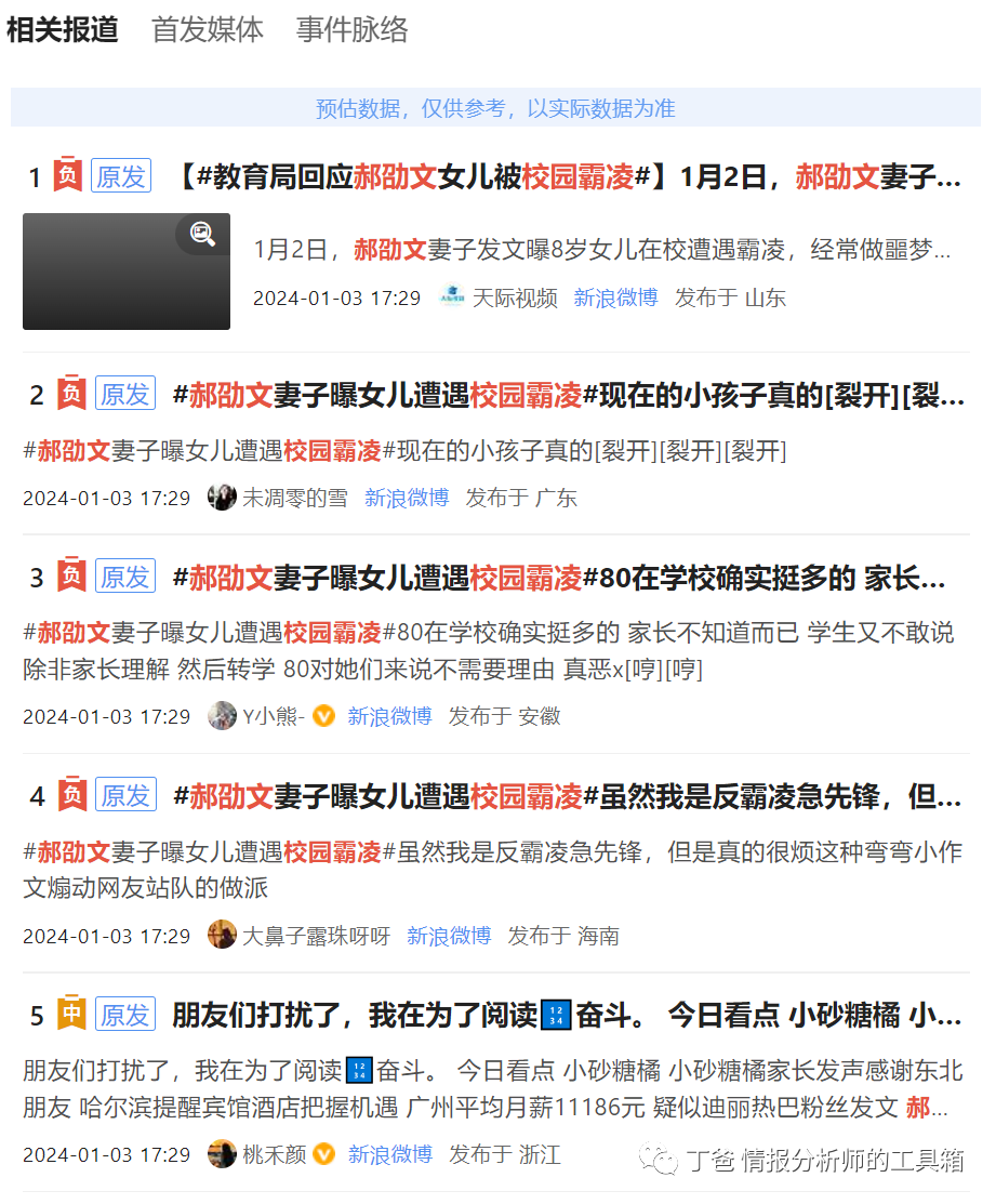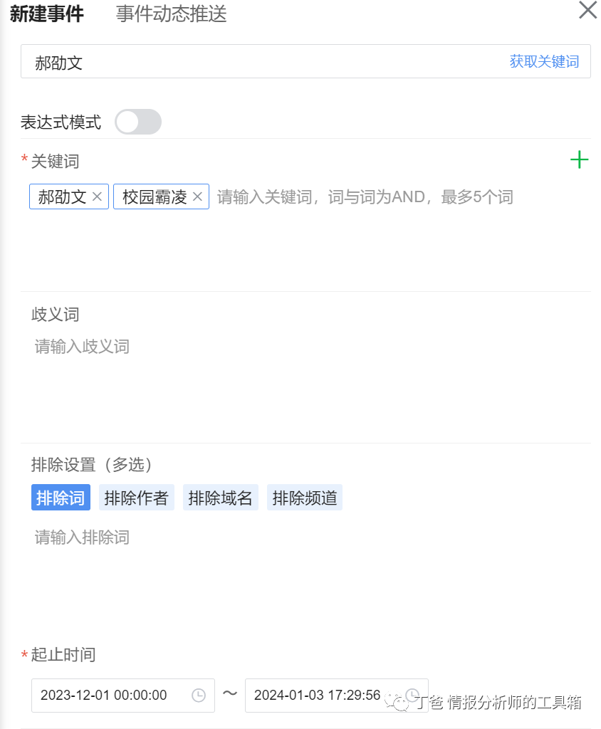 利用“舆情秘书”的事件分析功能新建一个事件,关键词“郝劭文”、”校园霸凌“,时间选择在”2023年12月1日0:00至2024年1月3日17:29“