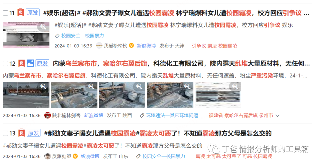 利用智慧星光“舆情秘书”对24小时内的网络舆情热点事件进行跟踪,发现郝劭文女儿遭遇校园霸凌事件被多个网络账号发布,在当日舆情榜中排名靠前。
