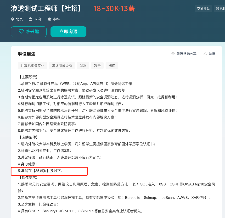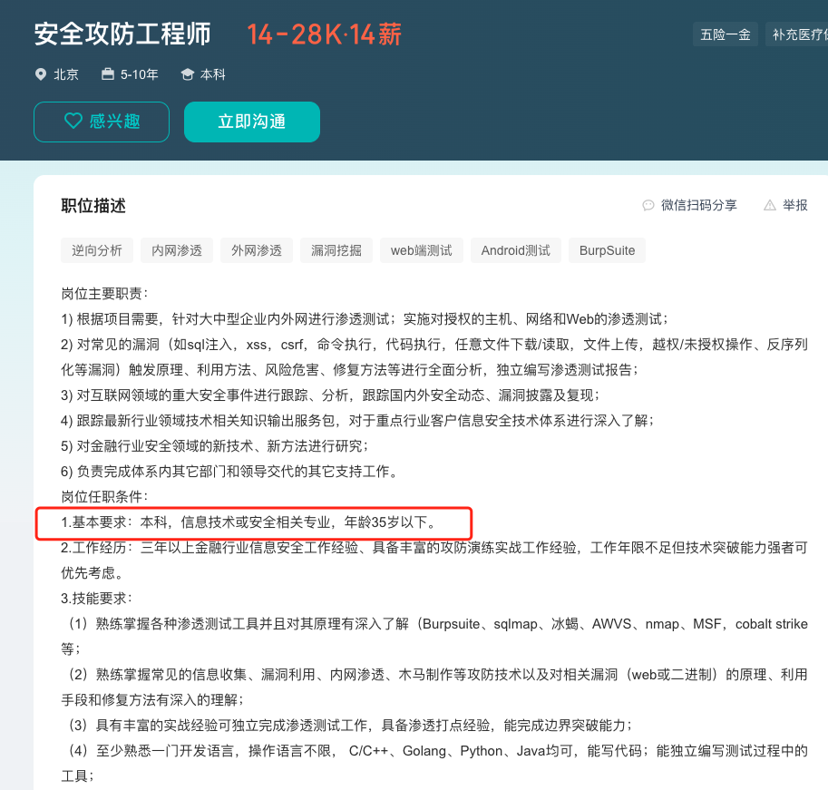 今天来一起聊聊互联网行业的“ 35 岁魔咒”,为什么是 35 岁?我们先来看两个安全行业的招聘要求: