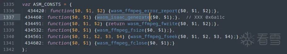 在wasm_video_decode.js中,wasm_isaac_generate作为一个汇编函数,可以在WebAssembly中通过_emscripten_asm_const_int接口被调用。