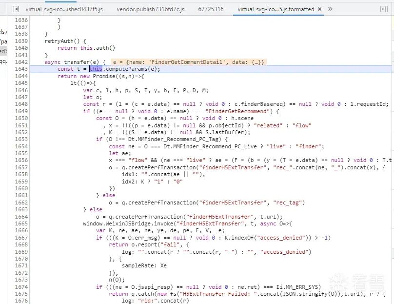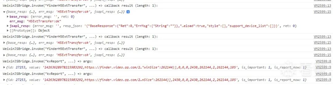 那么FinderGetCommentDetail又是通过什么获取到信息的呢。继续追踪调用。可以发现FinderGetCommentDetail最后使用了window.WeixinJSBridge.invoke来获取数据。