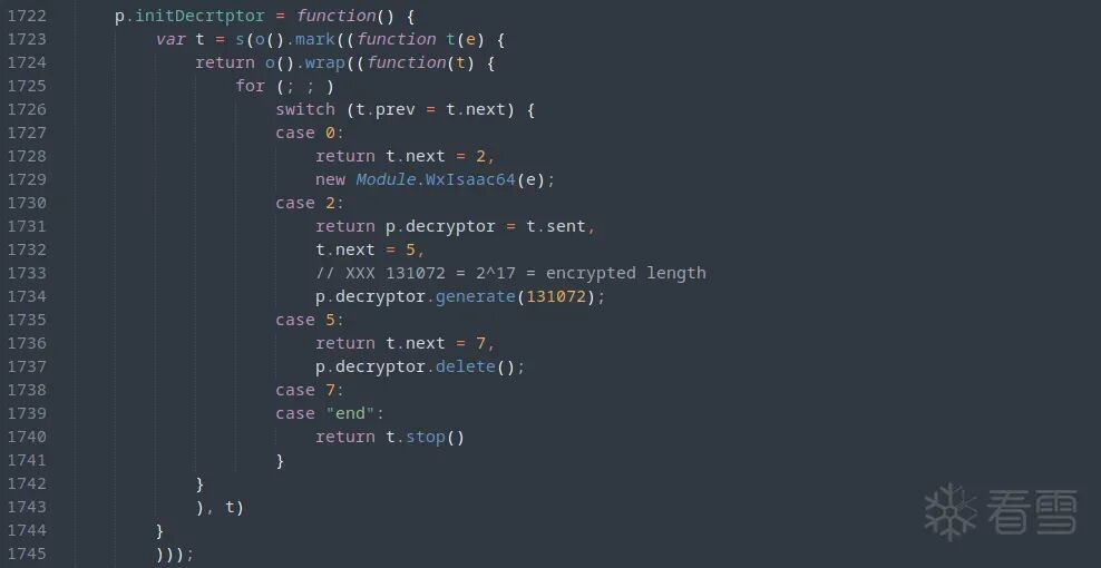 仔细分析揭示出decryptor也是WebAssembly环境中的一个对象,即WxIsaac64。