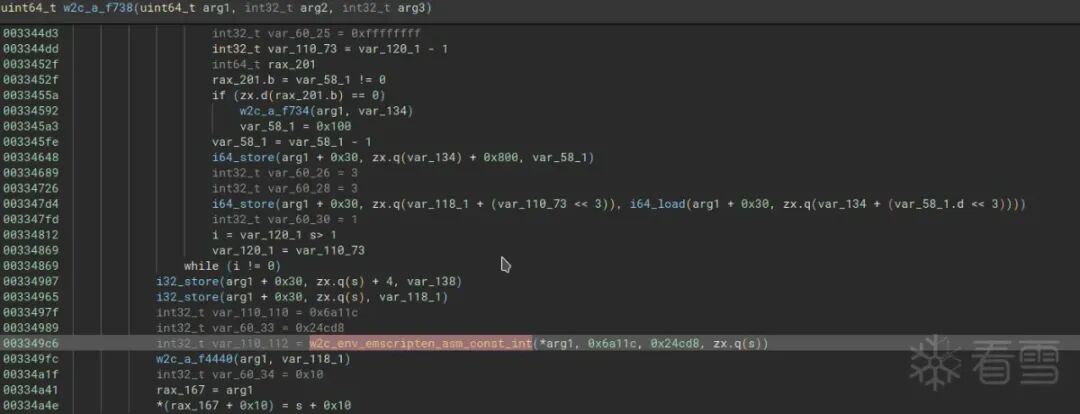 完成这些步骤后,我们得到一个二进制文件wasm_video_decode.o。将此文件拖入反编译软件,搜索_emscripten_asm_const_int的调用。我们发现wasm_isaac_generate在函数f378处被调用。