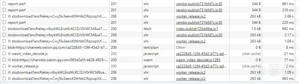 首先随便打开一个视频,我们可以看到很多请求。其中带有stodownload的就是下载的视频文件,但这些视频链接下载下来的内容是加密的。