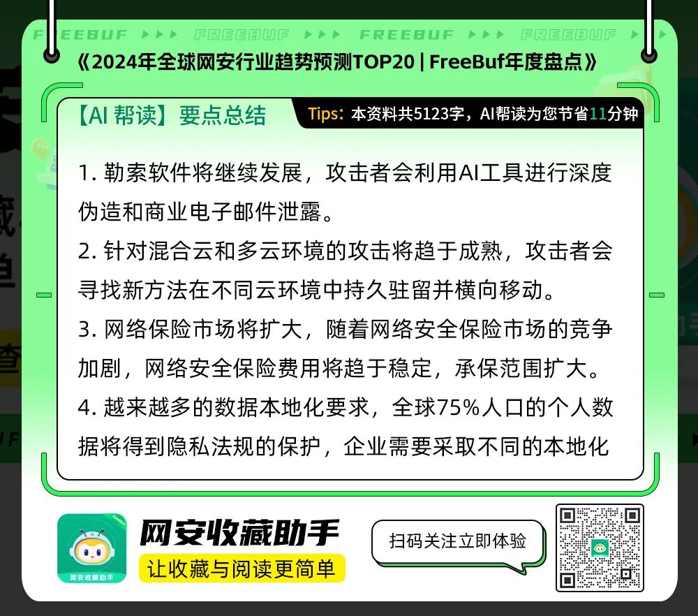 2024年,FreeBuf收集整理了多家权威机构的安全趋势预测,发现对于某些方向的预测,机构们保持着相似的看法或共同的主题,称之为共性预测。FreeBuf总结了5条共性预测,具体如下:
