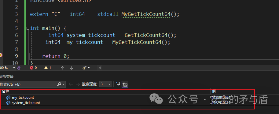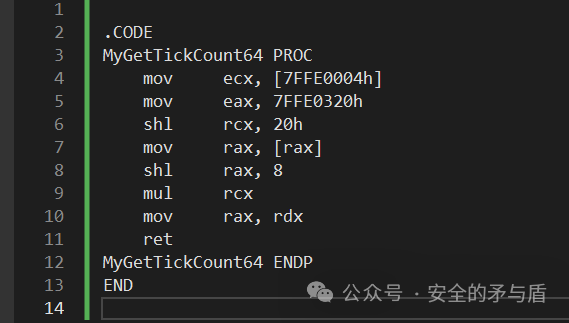 经过我的验证,函数中两个全局变量的偏移在不同的windows NT版本上都是一样的,所以我们可以直接使用如下汇编来完成自己的 GetTickCount64 函数,代码如下: