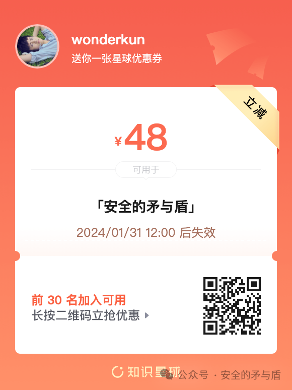 2024年,新的开始,新的征程,不变的是继续提升安全技术矛与盾的决心。新年之际小编为大家准备了优惠券福利,让你的学习之旅更加轻松愉快。抓紧时间,名额有限,快来领取,开启你的新技能探索之旅吧!