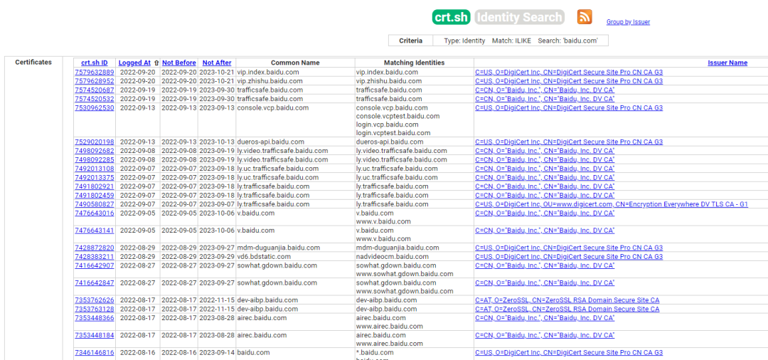 * [https://crt.sh/](https://crt.sh/):通过证书查找子域名和指纹识别;