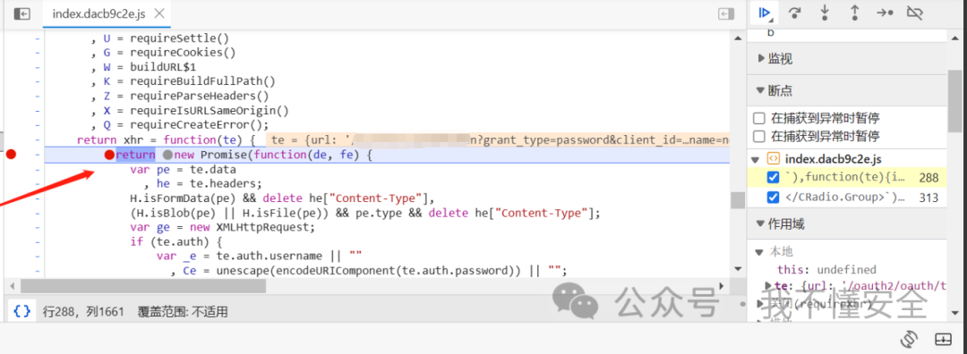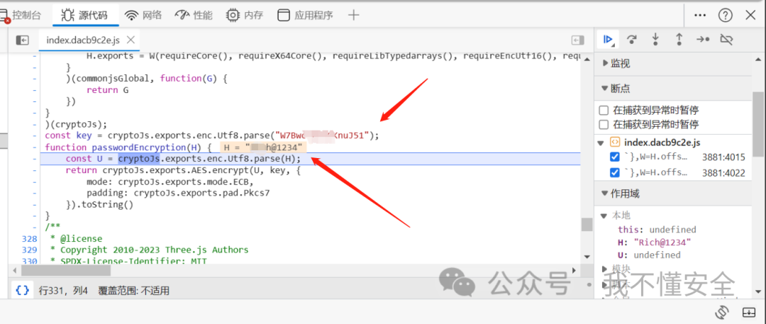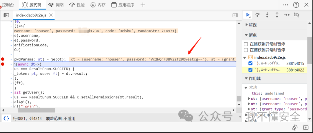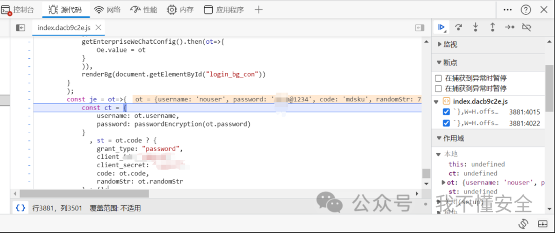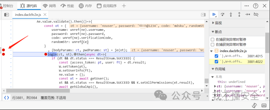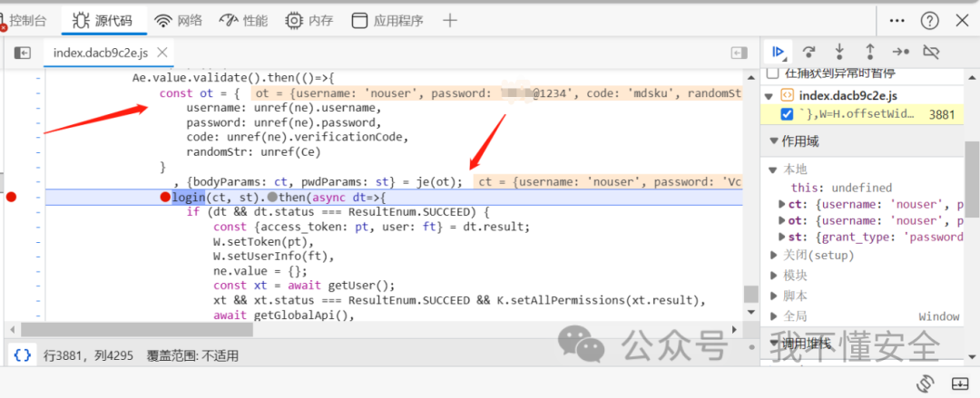 而后需要重新点击登录按钮,可以发现会话会直接在断点处停止,而后返回控制台,在控制台可以输入字符串或函数来查验结果