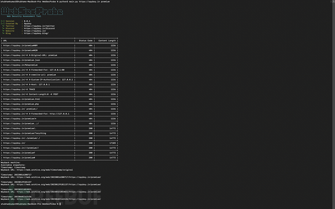 测试完所有的Payload之后,工具会查询Wayback Machine以获取目标URL/ 路径的快照。如果获取到了,则会打印最新的快照信息;