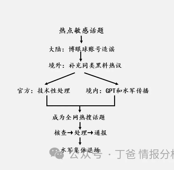 深入分析这些水军账号发帖和转帖情况,发现谣言在大陆首发以后,水军境外账号跟进造谣“大陆孩子住院花55万报销一万”,并向台湾医保官方回应等话题引导;随后,境外炮制更多黑料,然后通过水军在境内传播。