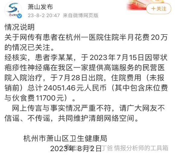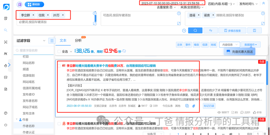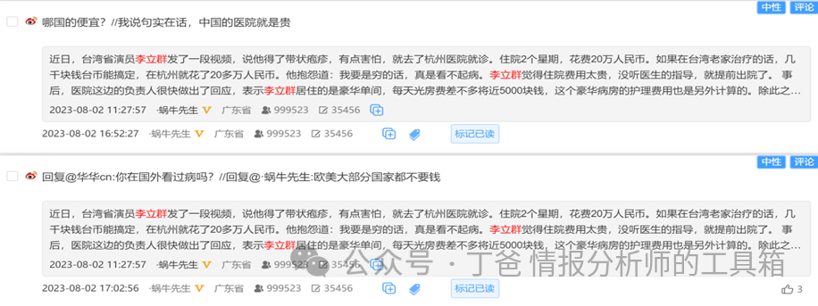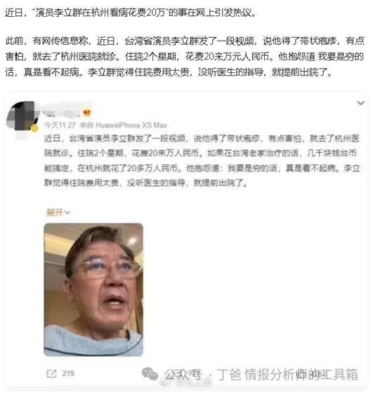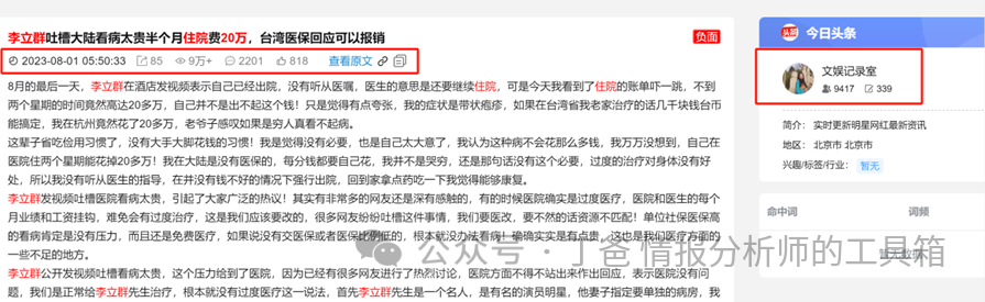首发帖子“李立群吐槽大陆看病太贵,半个月住院费20万”,8月1日凌晨5点发布于今日头条,始发账号:“文娱记录室”。该营销号在头条平台有9千多粉丝,但这篇帖子由于关注度较高,在平台算法机制的推荐下,浏览量超过9万+,评论量超2200+。